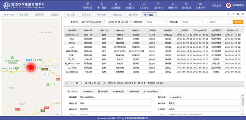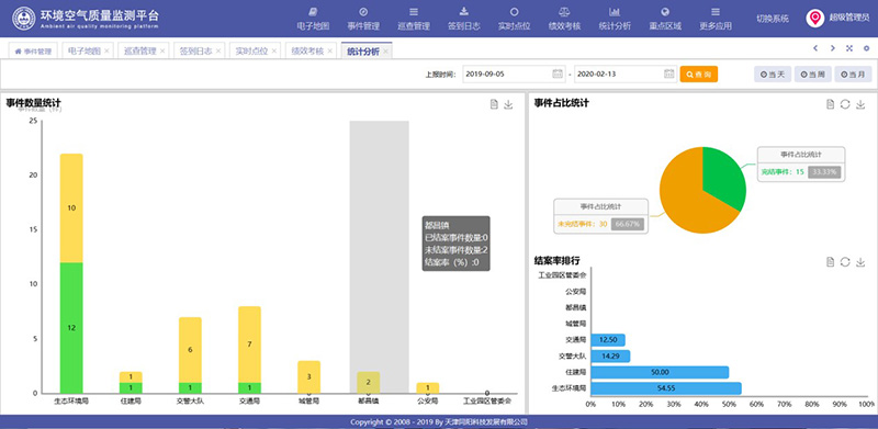 系統(tǒng)的主要功能模塊包括:電子地圖、事件管理、巡查管理、設(shè)備報警、簽到日志、實時點位、統(tǒng)計分析、績效考核、通知公告、重點區(qū)域、事件查詢、系統(tǒng)管理。