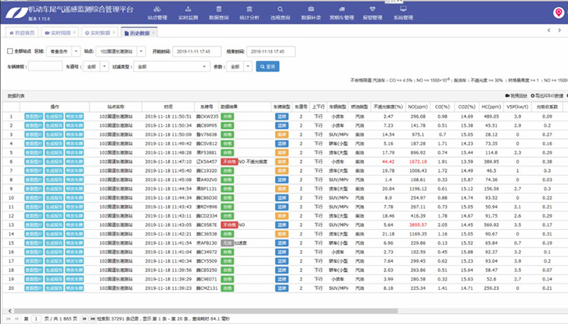 尾氣遙感檢測平臺實現(xiàn)了對機動車尾氣數(shù)據(jù)的采集、管理維護功能??梢詫崟r查詢固定式站點監(jiān)測數(shù)據(jù)及移動式站點監(jiān)測數(shù)據(jù)。所監(jiān)測的數(shù)據(jù)信息涵蓋了機動車尾氣檢測參數(shù)值、氣象參數(shù)數(shù)據(jù)、環(huán)境空氣質(zhì)量數(shù)據(jù)、黑煙車數(shù)據(jù)等。同時結(jié)合環(huán)境空氣質(zhì)量數(shù)據(jù)與尾氣檢測數(shù)據(jù)進行統(tǒng)計分析,并與交管局、車管所進行數(shù)據(jù)庫對接。形成了實時查詢和匹配車輛基本信息于一體的數(shù)據(jù)檢測、統(tǒng)計、分析系統(tǒng)。