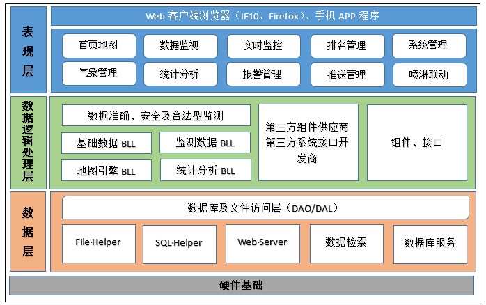 系統(tǒng)的主要功能模塊包括:電子地圖、實時監(jiān)控、數(shù)據(jù)查詢、報警管理、站點排名、統(tǒng)計分析、網(wǎng)絡(luò)監(jiān)控、噴淋聯(lián)動、系統(tǒng)管理、運(yùn)維管理。