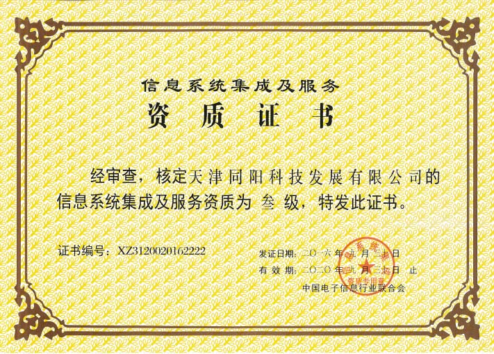 天津同陽科技發(fā)展有限公司獲得叁級信息系統(tǒng)集成及服務(wù)資質(zhì)認(rèn)證。