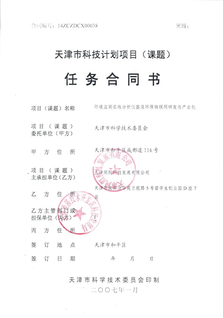 更新時(shí)間: 點(diǎn)擊:25552 所屬欄目:公司新聞 Update Time: Hits:25552 Belong Column:News2014年11月19日,由天津同陽科技發(fā)展有限公司牽頭的“環(huán)境監(jiān)測在線分析儀器及環(huán)保物聯(lián)網(wǎng)研發(fā)與產(chǎn)業(yè)化”項(xiàng)目,經(jīng)天津市科學(xué)技術(shù)委員會(huì)批準(zhǔn)列入“2014年天津市科技支撐計(jì)劃重點(diǎn)項(xiàng)目”,在“資源環(huán)境”領(lǐng)域獲得立項(xiàng)支持。