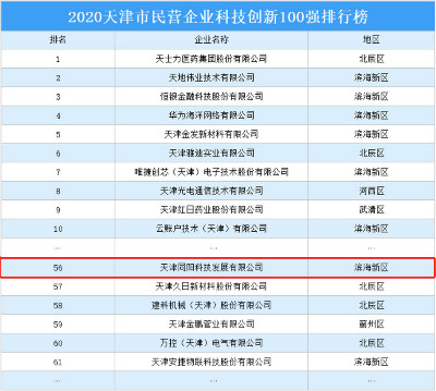 同陽科技榮登2020天津市民營企業(yè)科技創(chuàng)新百強(qiáng)排行榜