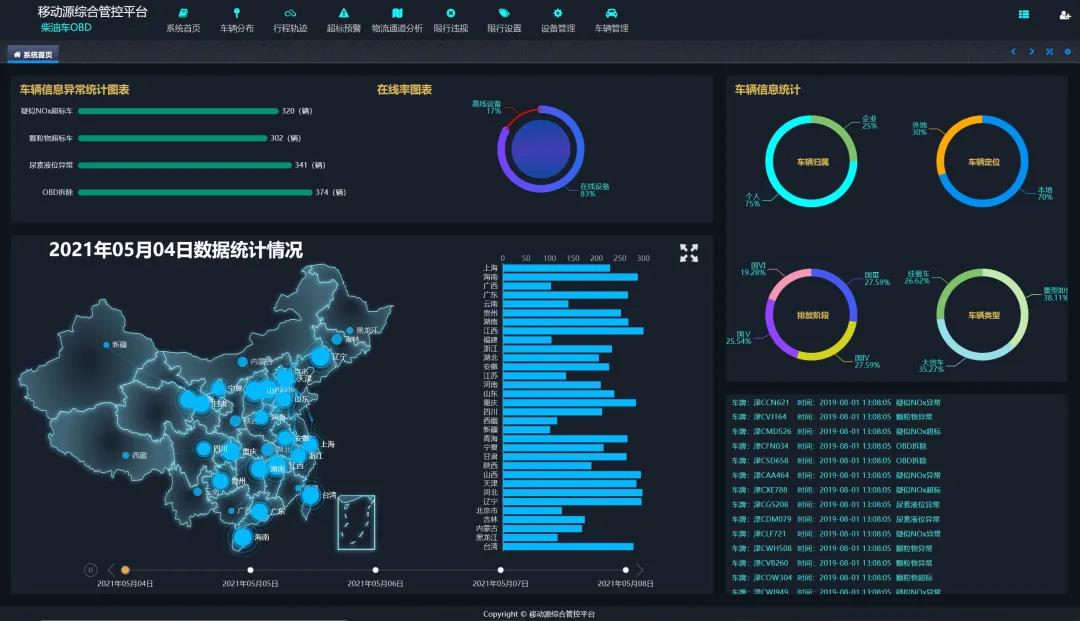 軟件平臺功能包括:GIS一張圖展示、車輛分布、形成軌跡管理及超標(biāo)報警查詢等。該系統(tǒng)通過一張GIS圖展示在線柴油貨車所在位置的熱力圖、車輛的分類比例以及排放階段占比等,可動態(tài)滾動播放柴油貨車的預(yù)警報警信息。