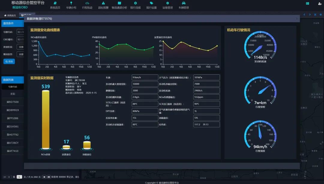 客戶可根據(jù)需要通過查詢功能查看某一輛柴油貨車的位置、里程、實時車速、污染物排放曲線和尿素消耗曲線等詳細(xì)信息。