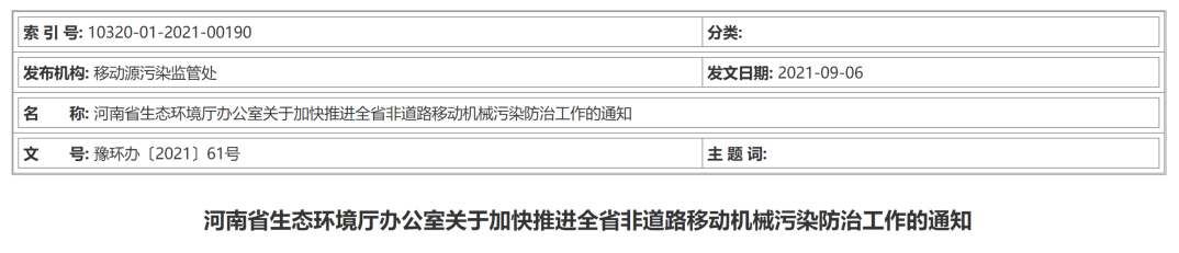 河南省生態(tài)環(huán)境廳于近日發(fā)布的《河南省生態(tài)環(huán)境廳辦公室關(guān)于加快推進(jìn)全省非道路移動機(jī)械污染防治工作的通知》中提出力爭在2021年底前完成20萬臺非道路移動機(jī)械的信息采集、環(huán)保標(biāo)識下發(fā)和現(xiàn)在監(jiān)控設(shè)備安裝等工作。經(jīng)過深度治理,非道路移動機(jī)械顆粒物在線數(shù)據(jù)可達(dá)到《非道路柴油移動機(jī)械排氣煙度限值及測量方法》(GB36886-2018)規(guī)定的Ⅲ類限值,并對顆粒物排放數(shù)據(jù)實現(xiàn)在線監(jiān)測數(shù)據(jù)與省、市管理平臺聯(lián)網(wǎng)。還同時要求了嚴(yán)格執(zhí)行非道路移動機(jī)械的監(jiān)督抽查工作等內(nèi)容。