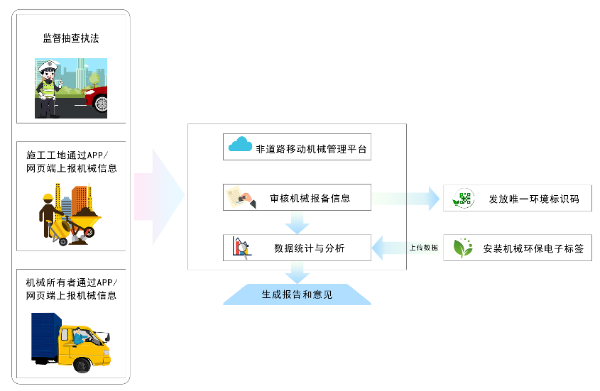 非道路移動機(jī)械種類繁多,應(yīng)用廣泛,相對于機(jī)動車而言,存在底數(shù)不清、污染控制技術(shù)水平相對落后、污染物排放量大等問題。因此非道路移動機(jī)械監(jiān)管需要通過機(jī)械信息摸底調(diào)查、環(huán)保編碼上牌及安裝電子標(biāo)簽和在線尾氣傳感器、監(jiān)督抽查執(zhí)法的三步走來實現(xiàn)全方位監(jiān)管。