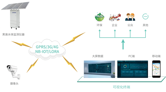 黑臭水體在線(xiàn)自動(dòng)監(jiān)測(cè)系統(tǒng)基于物聯(lián)網(wǎng)的理念,采用信息化手段,結(jié)合GIS展示,通過(guò)建立微型水站的方式實(shí)現(xiàn)對(duì)黑臭水體水質(zhì)、環(huán)境因素等的實(shí)時(shí)監(jiān)測(cè),通過(guò)專(zhuān)用的通訊系統(tǒng),將監(jiān)測(cè)數(shù)據(jù)上傳至遠(yuǎn)程的監(jiān)控中心和托管站,從而實(shí)現(xiàn)遠(yuǎn)程監(jiān)控的功能,建立長(zhǎng)效的監(jiān)督管理機(jī)制,動(dòng)態(tài)展示黑臭水體治理成果,最終達(dá)到提升人居環(huán)境質(zhì)量,改善城市生態(tài)環(huán)境的目的。